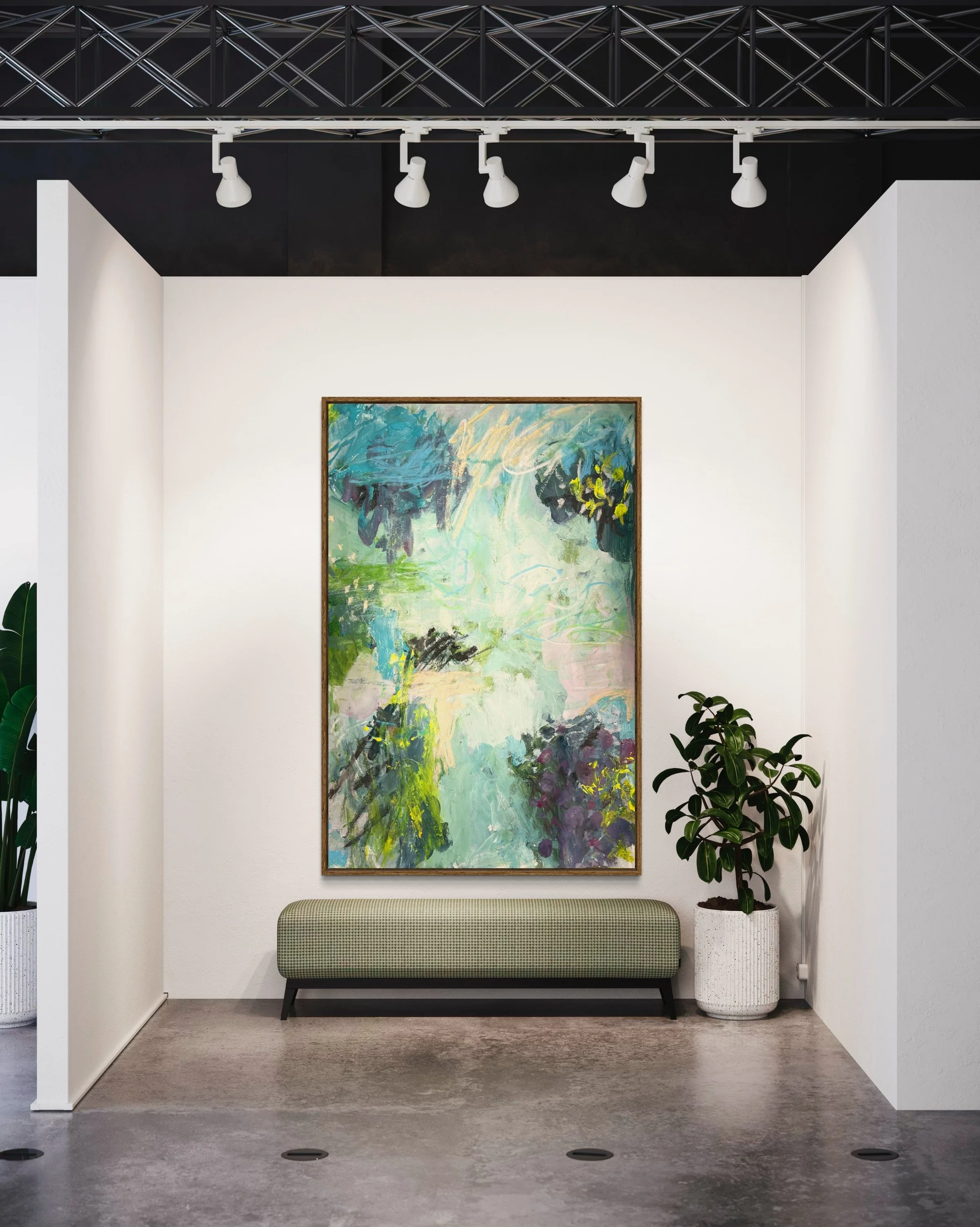 Modern art gallery interior with abstract painting, green bench, and potted plant under spotlight.
